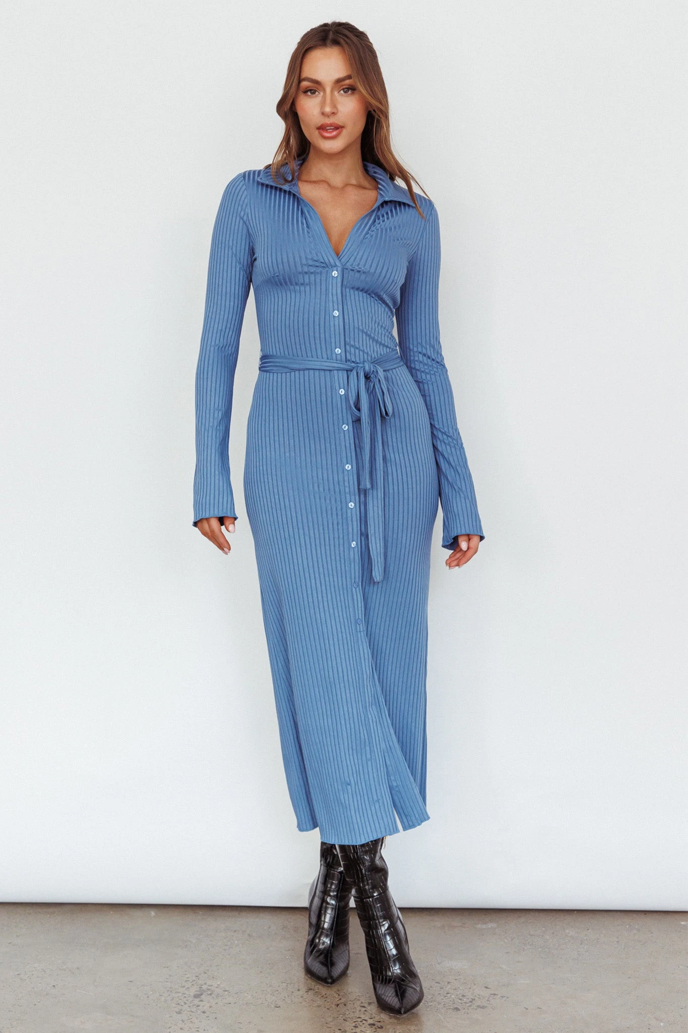 Slay your day in our chic Eastcoast midi dress. Featuring a stretch, ribbed fabric to hug your curves and a faux button placket in the front. Take it from your 9-5 to happy hour cocktails with your girls teamed with boots and a tote for a look that will turn heads.