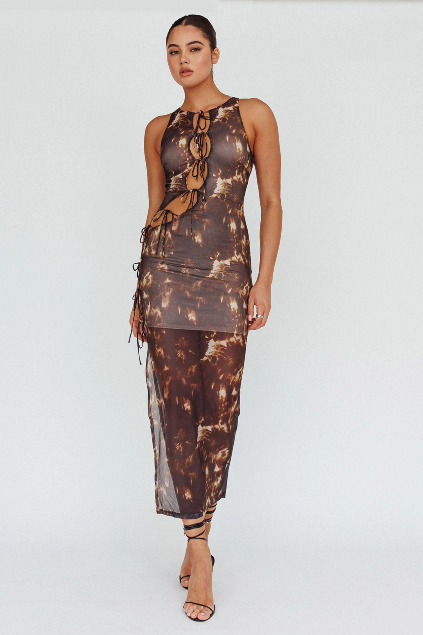 - Brown, fire print maxi dress